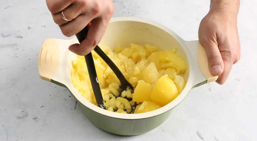 Когда картофель будет готов, воду слейте, оставив около 100–150 мл. Добавьте в кастрюлю 2 ст. л. оливкового масла и разомните толкушкой до получения пюре.