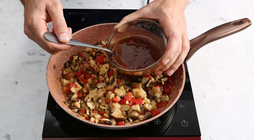 Сладкий перец и лук для запеканки мелко нарежьте. В сковороде нагрейте оставшееся масло. Выложите в нее подготовленные овощи и подрумяньте в течение 4 минут. Добавьте грибы и, помешивая, жарьте до выпаривания жидкости. Влейте приготовленный ранее соус и перемешайте.